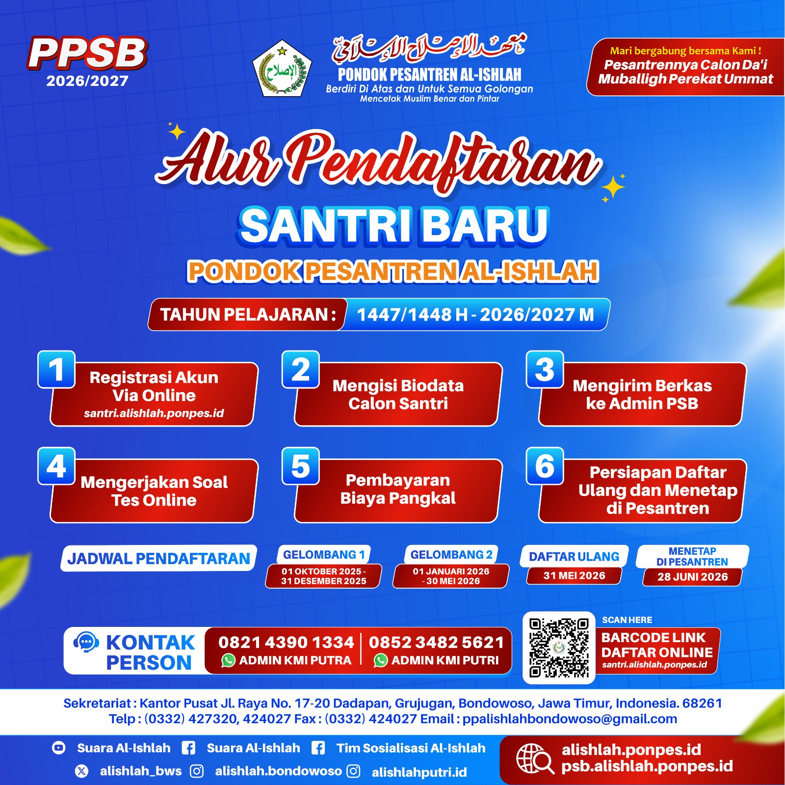 Pendaftaran Santri Baru (PSB) KMI Al-Ishlah Putra & Putri Tahun Pelajaran 2026/2027 dibuka pada tanggal 1 Oktober 2025 s.d. 30 Mei 2026